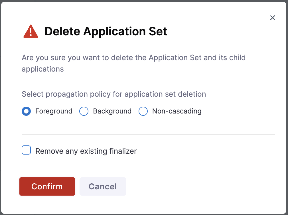 • Background: Deletes the ApplicationSet immediately and removes child applications asynchronously in the background. The ApplicationSet is removed from the UI before all resources are fully cleaned up.