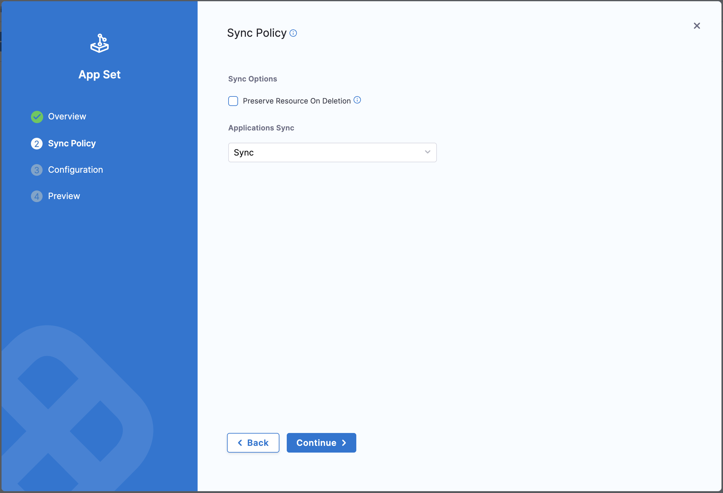 Select the sync policy for applications created by this ApplicationSet.