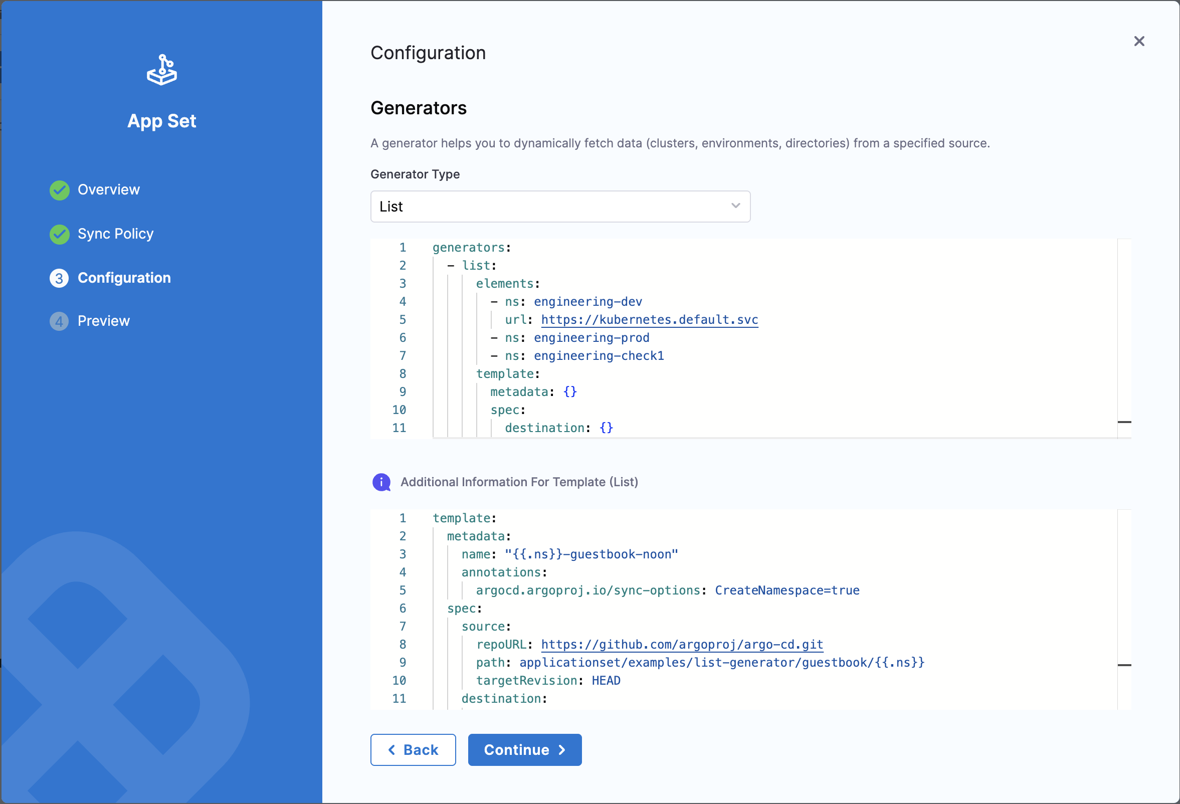 The Configuration tab is where you define the generator and template for your ApplicationSet.
