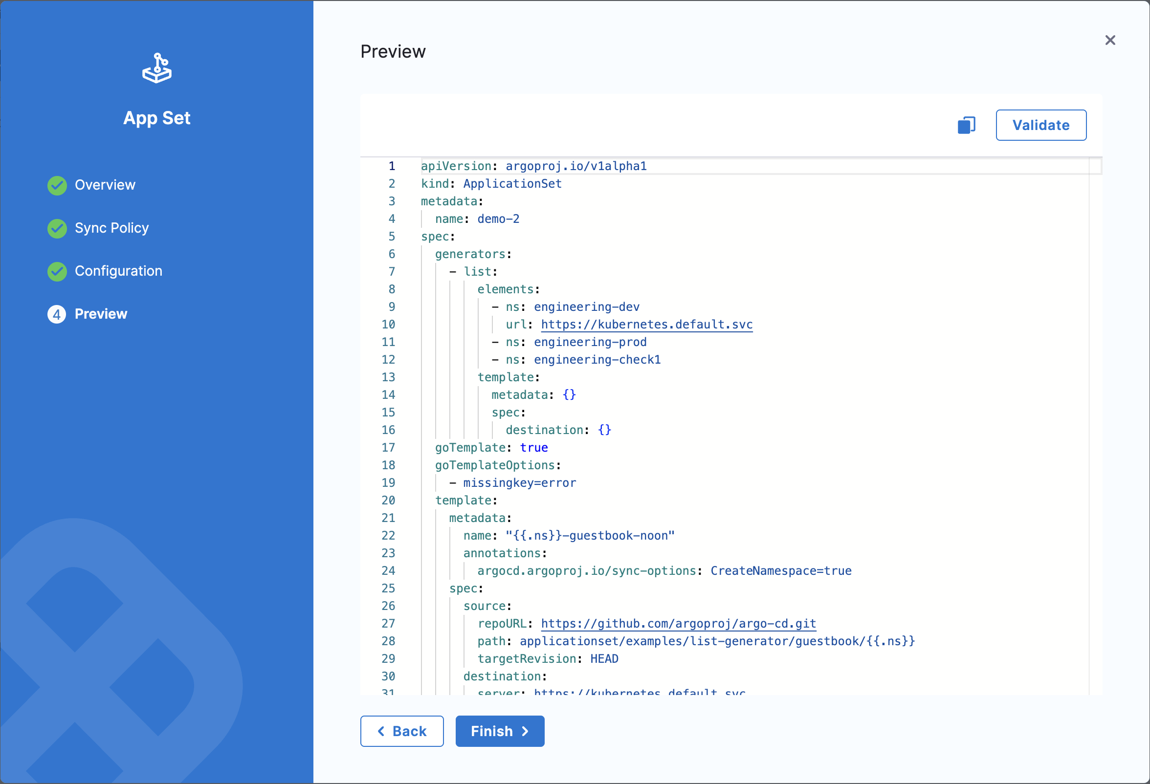 • Validate and preview ApplicationSet manifests