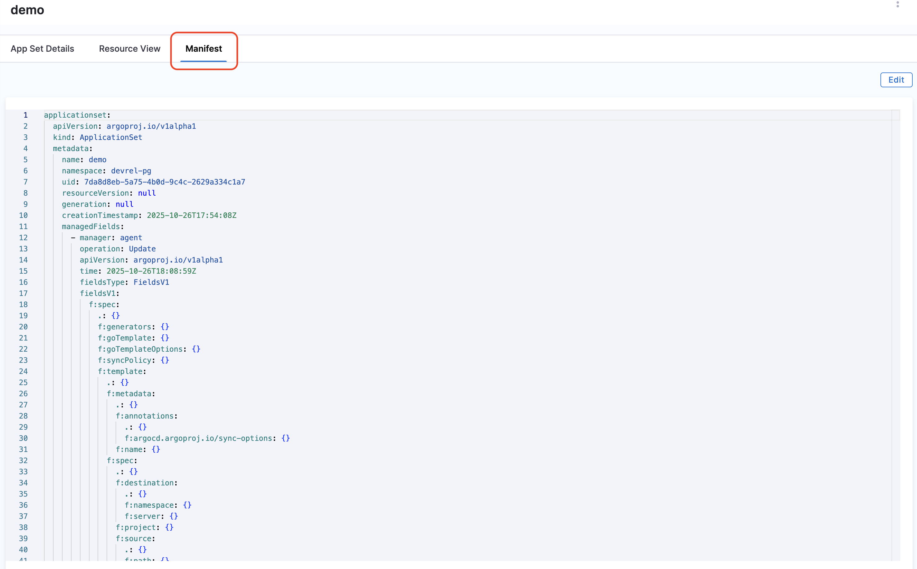 1. Click on the Manifest tab to see the complete manifest generated for the ApplicationSet.