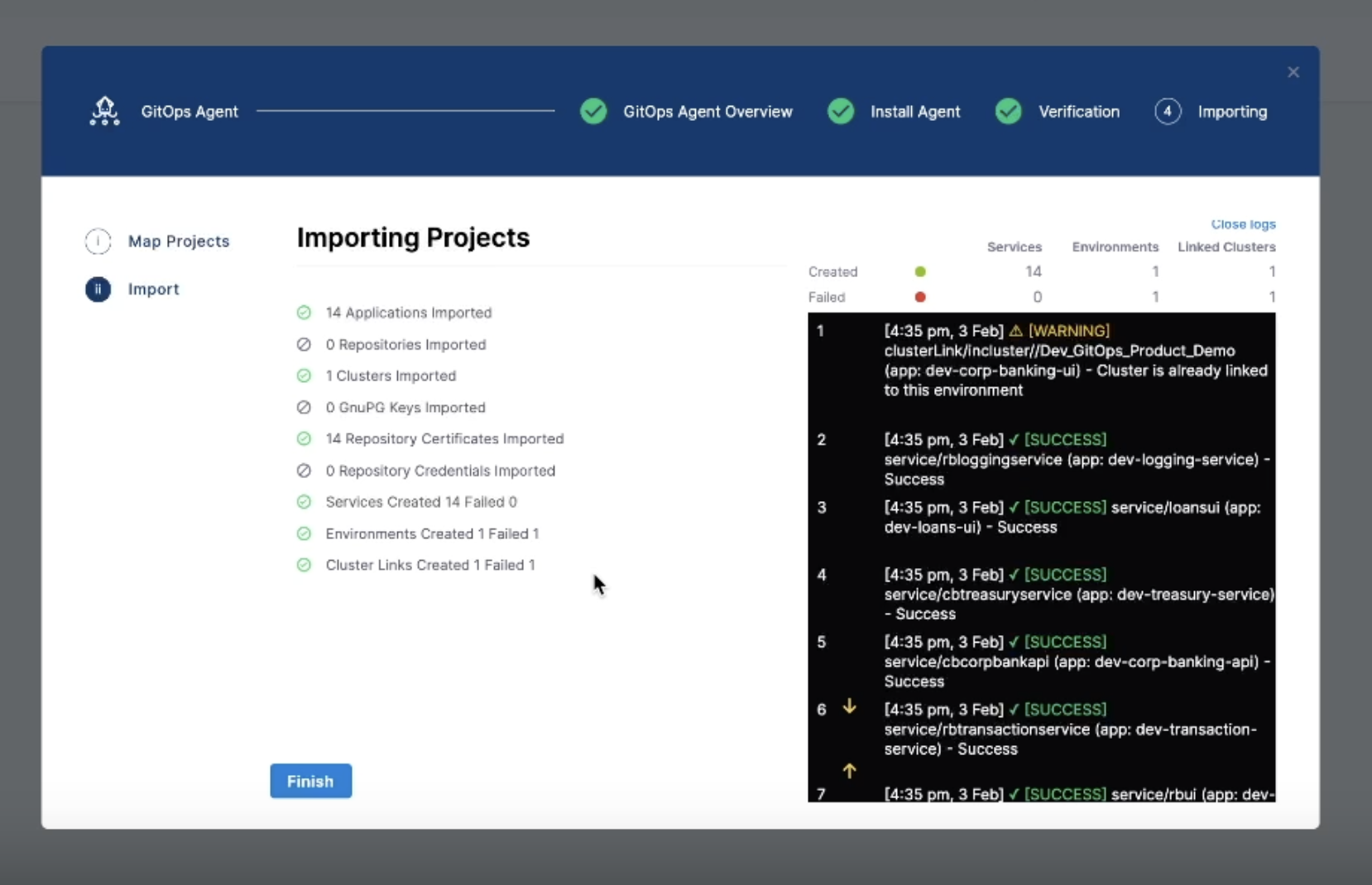 1. Import the project: Select Import & Continue. Harness processes all applications generated by the ApplicationSet. The import summary shows the number of services, environments, and cluster links that were created or mapped.