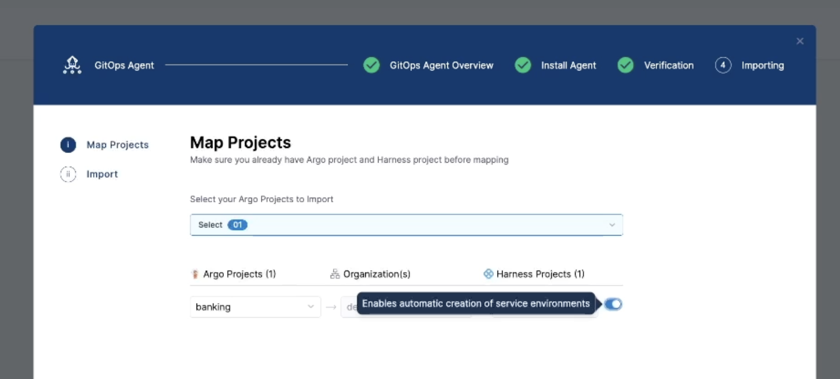 2. Enable the toggle on the Map Projects screen: When importing the Argo CD project during the BYOA agent setup, turn on the Enables automatic creation of service environments toggle.