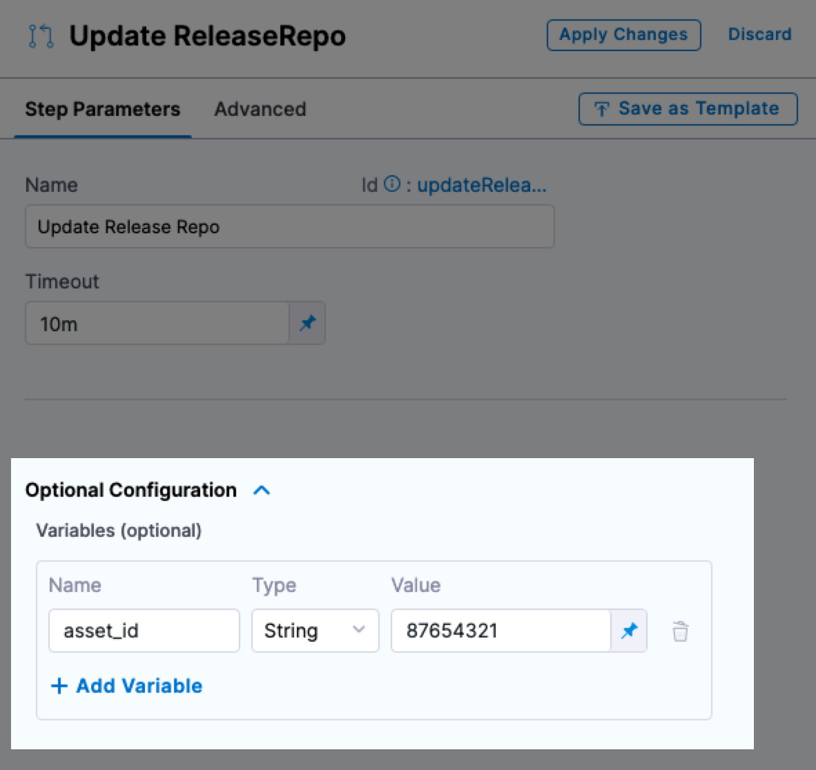 In Environment Variables, for asset_id, enter the value