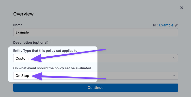 The Policy Set you select must be evaluated On Step.Currently, only the Custom entity type is supported. The Policy Set you select must have the Custom entity type selected. Also, select how you want the pipeline to handle policy evaluation failures: