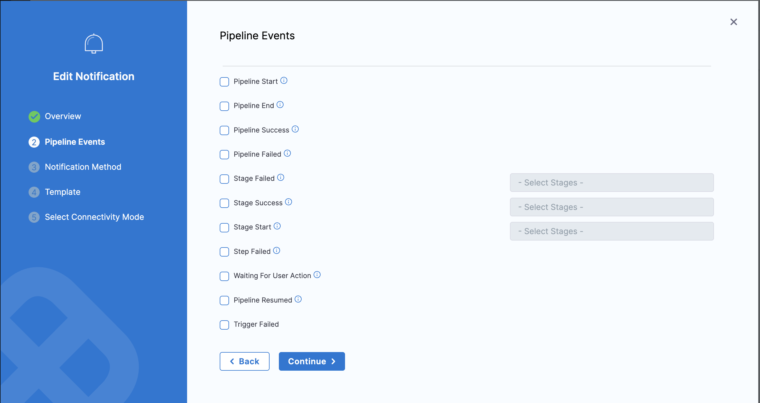 Event notifications are set up using Notification Rules in your pipeline. You select the types of events to send, and then select how you want to send notifications. When those events occur, Harness sends event information to those channels and recipients.