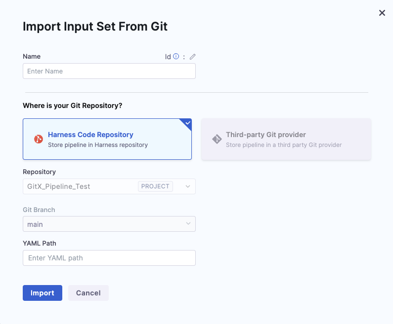 6. Enter the YAML Path from where you want to import the Input Set. Make sure that your YAML path starts with .harness/ and the YAML file already exists in the specified Git repo and branch.