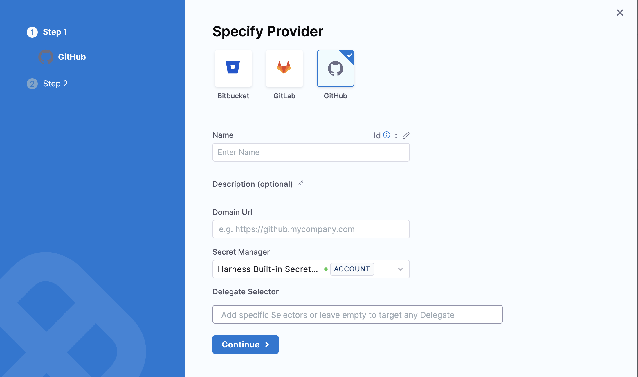 - Specify the Delegate Selector. Click on continue.