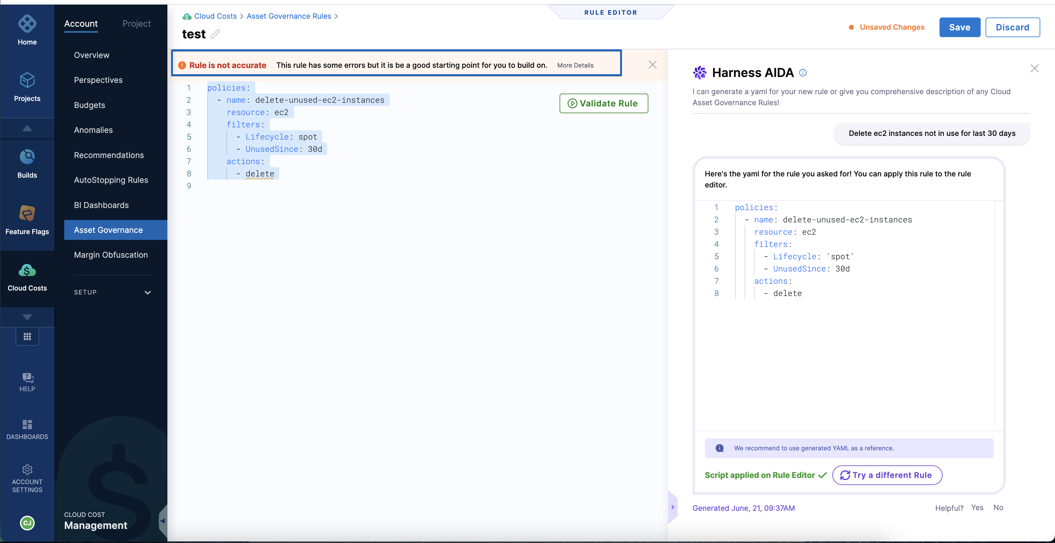 By enforcing governance rules, asset governance policies play a crucial role in governing cloud assets and optimizing costs. At times, authoring these policies can be challenging and confusing. In such situations, the Harness AI can assist with creating policies. Harness AI offers a user-friendly interface and serves as an excellent starting point for establishing the necessary policies. By leveraging this tool, you can streamline the process of policy development and ensure that the required policies are effectively implemented.
