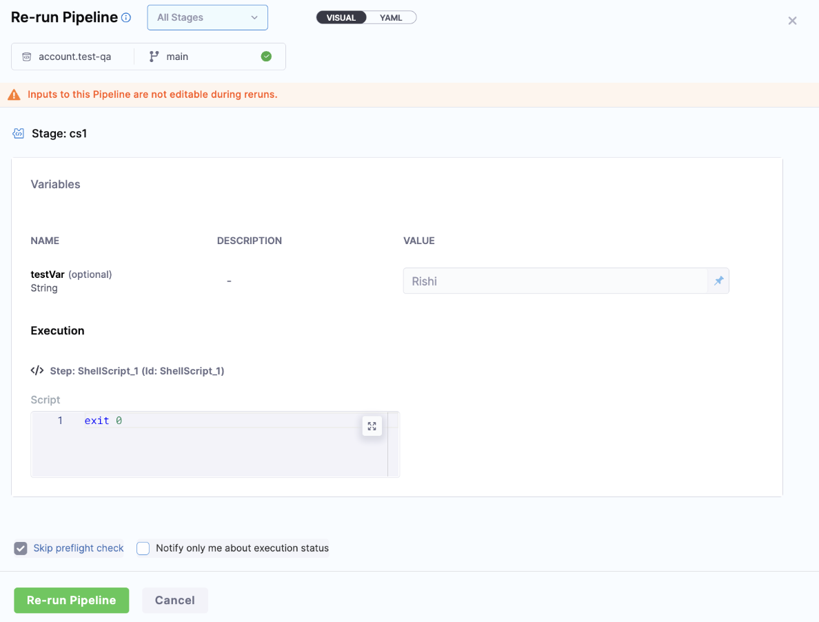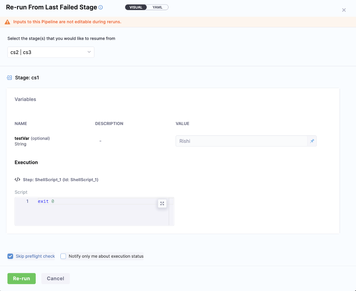 You can configure your pipelines to have no Input change during re-run. This allows you to have consistency in re-run behavior, especially in pipelines where input changes should be restricted after the initial execution.