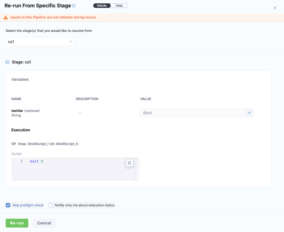 When the above setting is enabled, the API call to Re-run the pipeline ignores any inputs provided. Normally, on re-runs, the inputs are sent again in the API call. However, with this setting enabled, even if inputs are provided, they will be ignored, and the inputs from the original execution will be used.