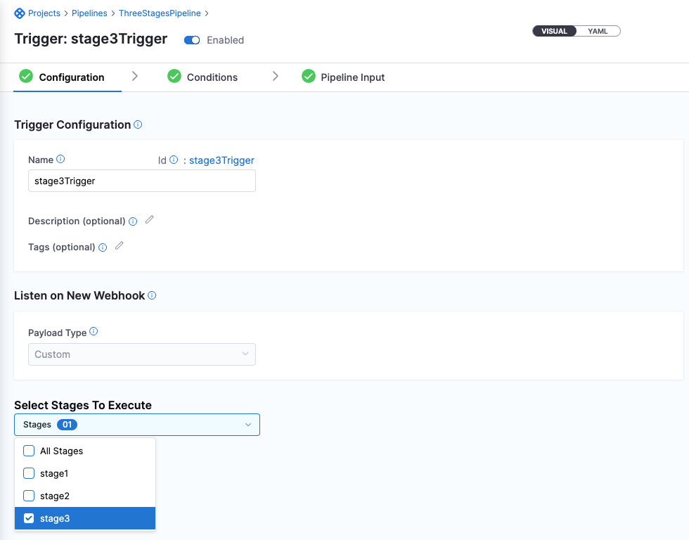 3. When you create a trigger, in the Configuration tab, select the stages you want to execute.