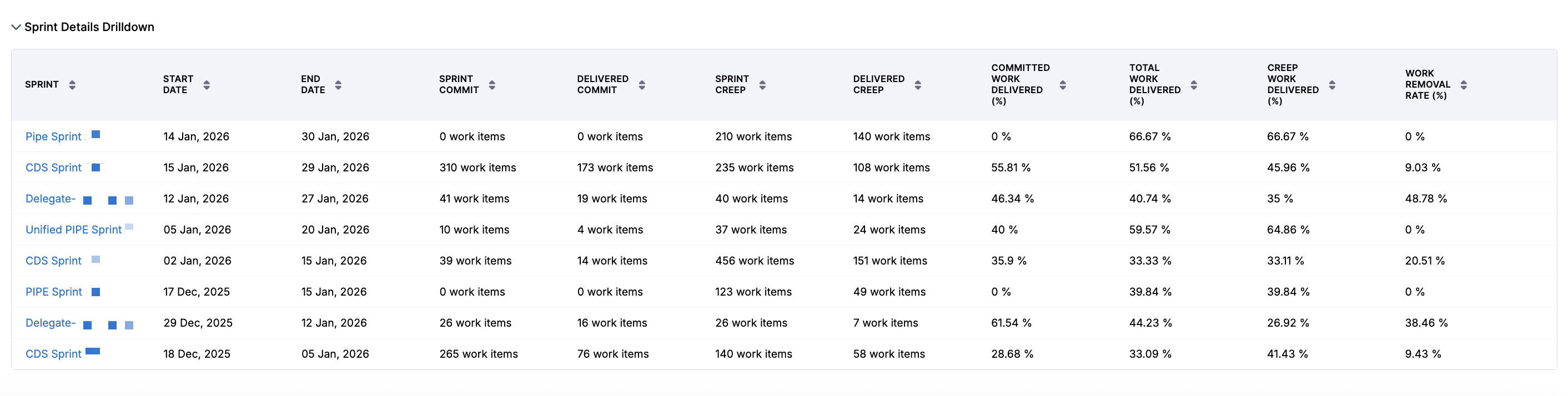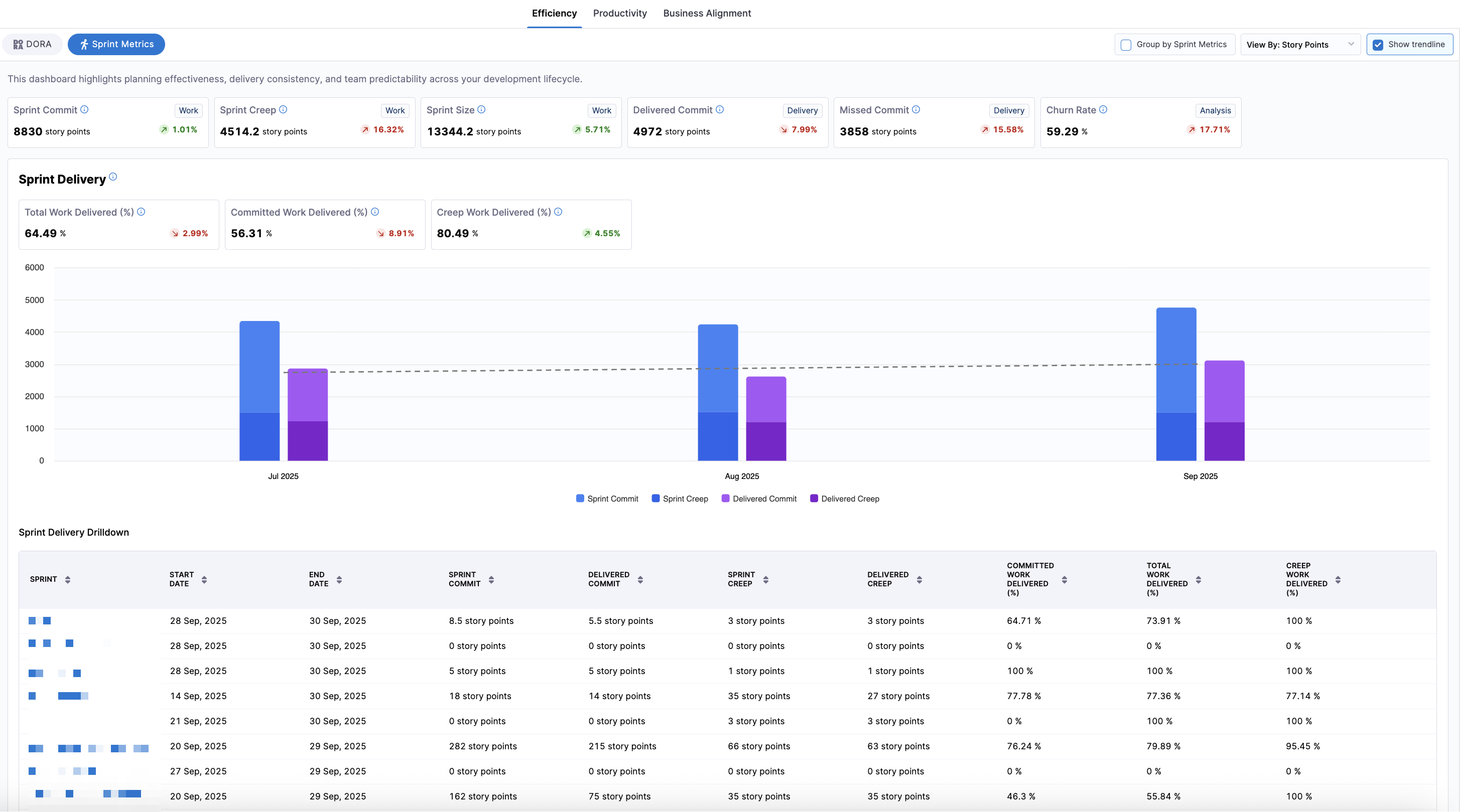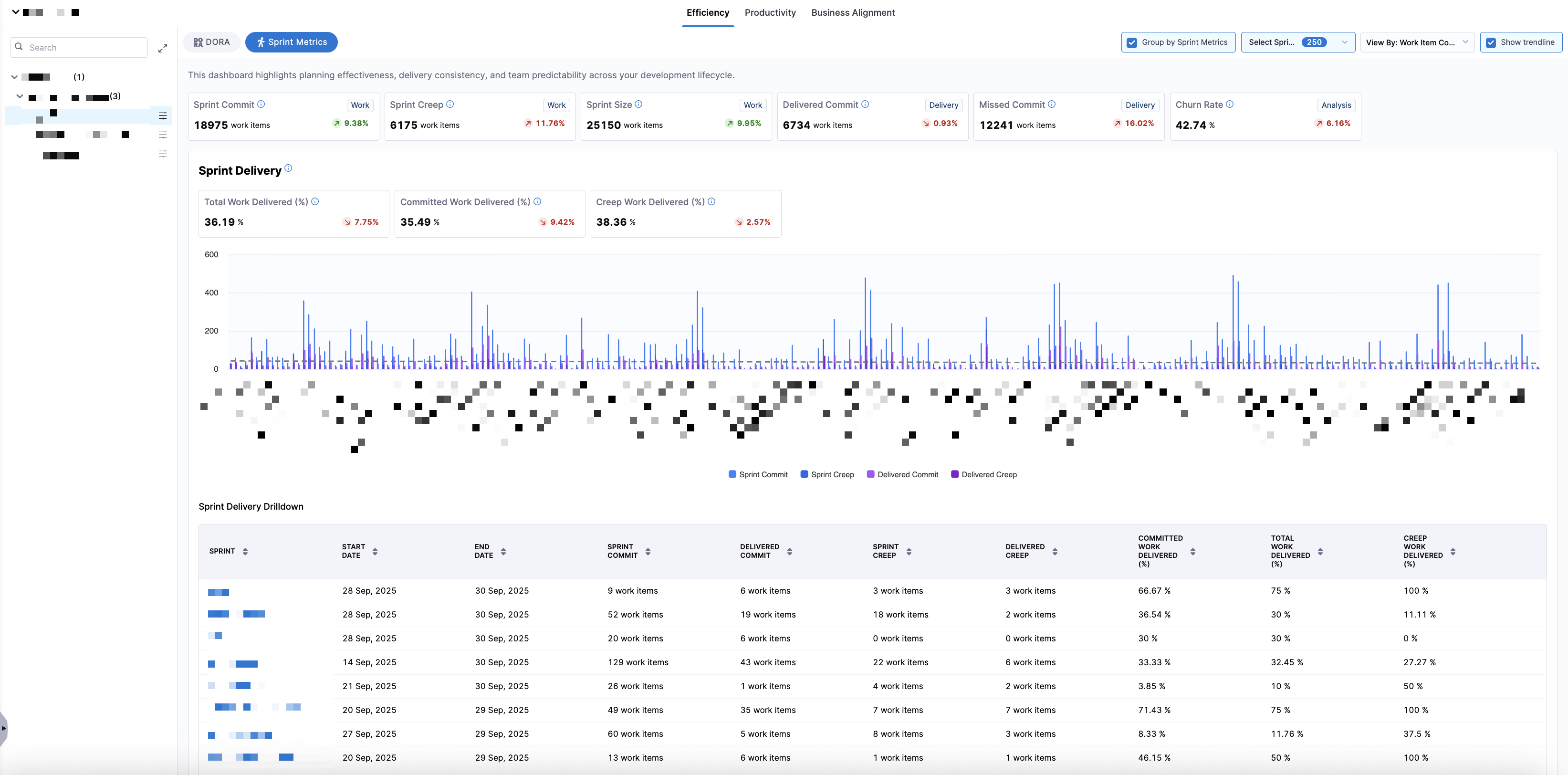 • Delivery efficiency (Total Work Delivered %, Committed Work Delivered %, Creep Work Delivered %, Work Removal Rate %)