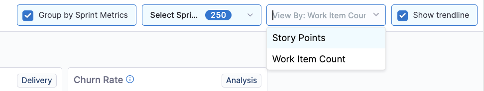 To view the data by Story Points or Work Item Count, click the View By dropdown menu.