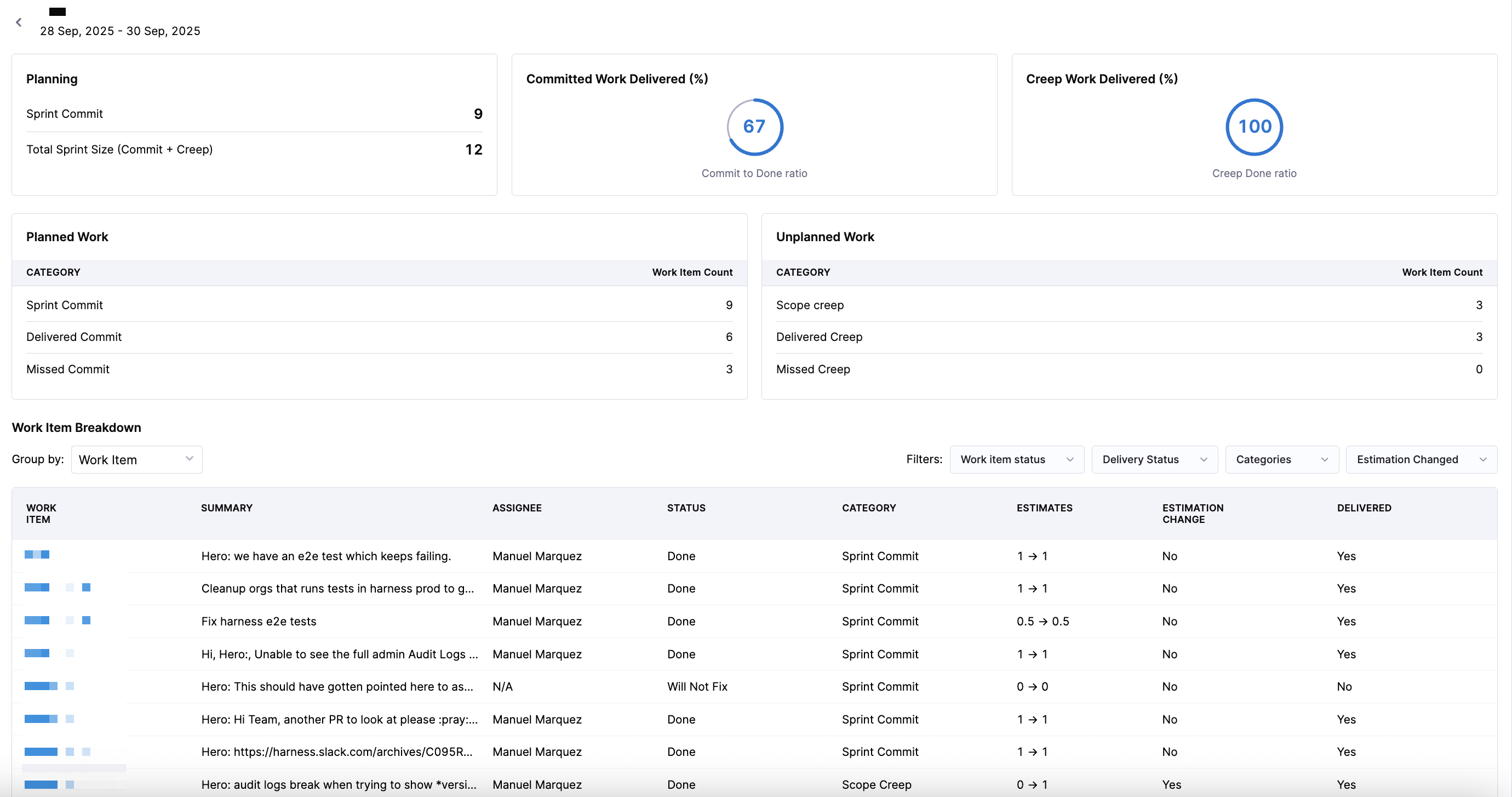 When you click into a sprint, you can access sprint-specific delivery performance and work item or story point-level drilldowns, allowing you to analyze which committed items were delivered, which creep items were added and delivered, which items were missed, and how individual work items contributed to sprint outcomes.