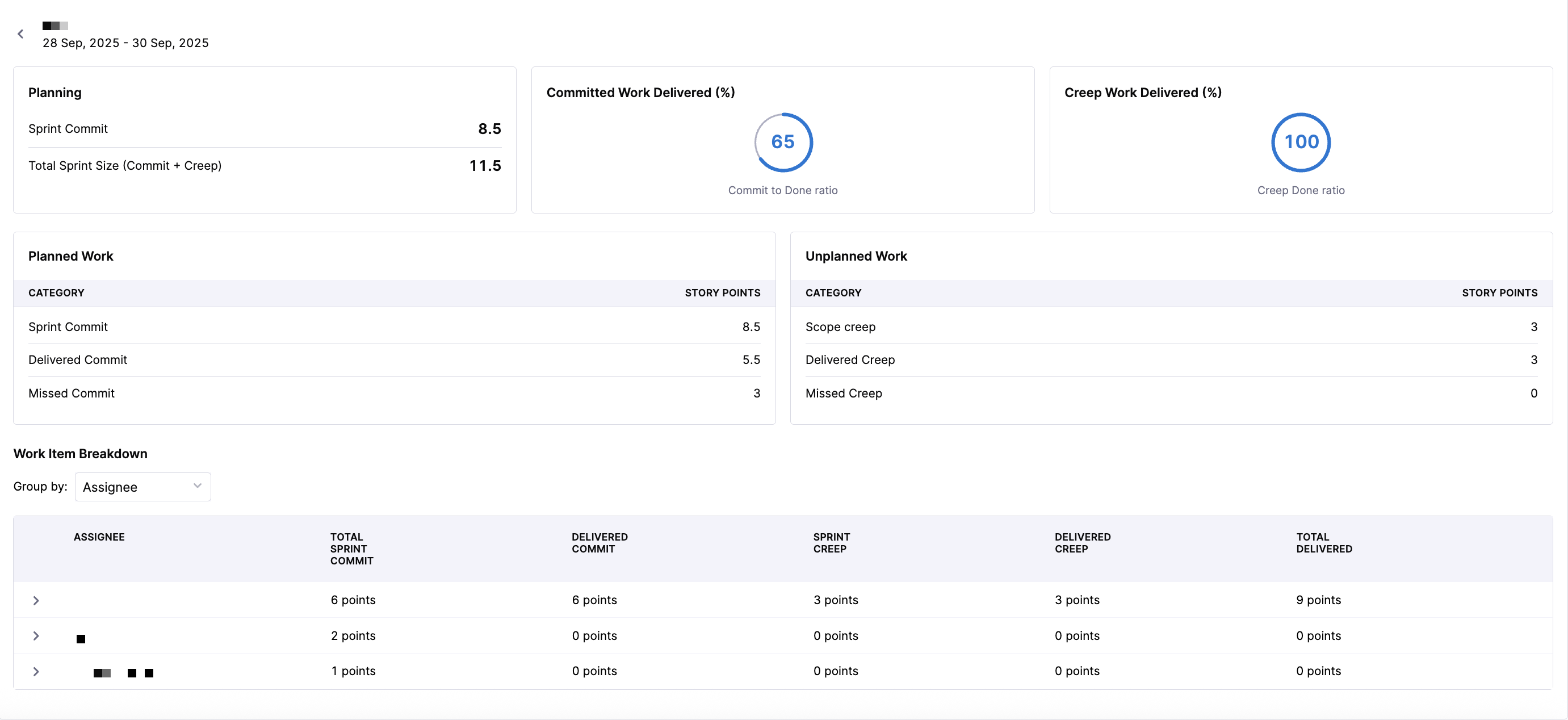In addition to work item-level drilldown, you can also evaluate how work is distributed across the engineering team using assignee-based analysis. To see assignees displayed per sprint, select Assignee in the Group by dropdown menu.