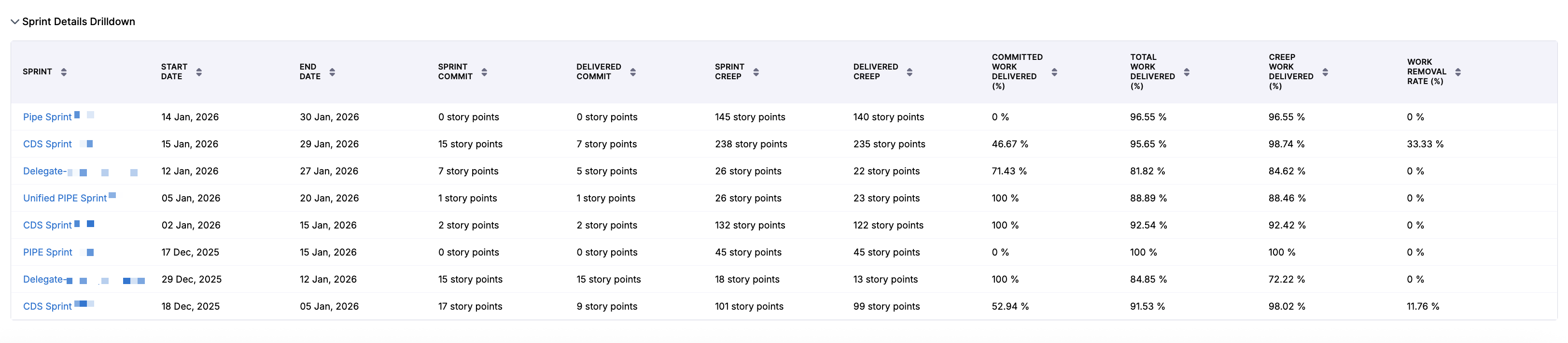 The default sprint view displays metrics across all selected sprints, including Start Date, End Date, Sprint Commit, Delivered Commit, Sprint Creep, Delivered Creep, Committed Work Delivered, Total Work Delivered, Creep Work Delivered, and Work Removal Rate.