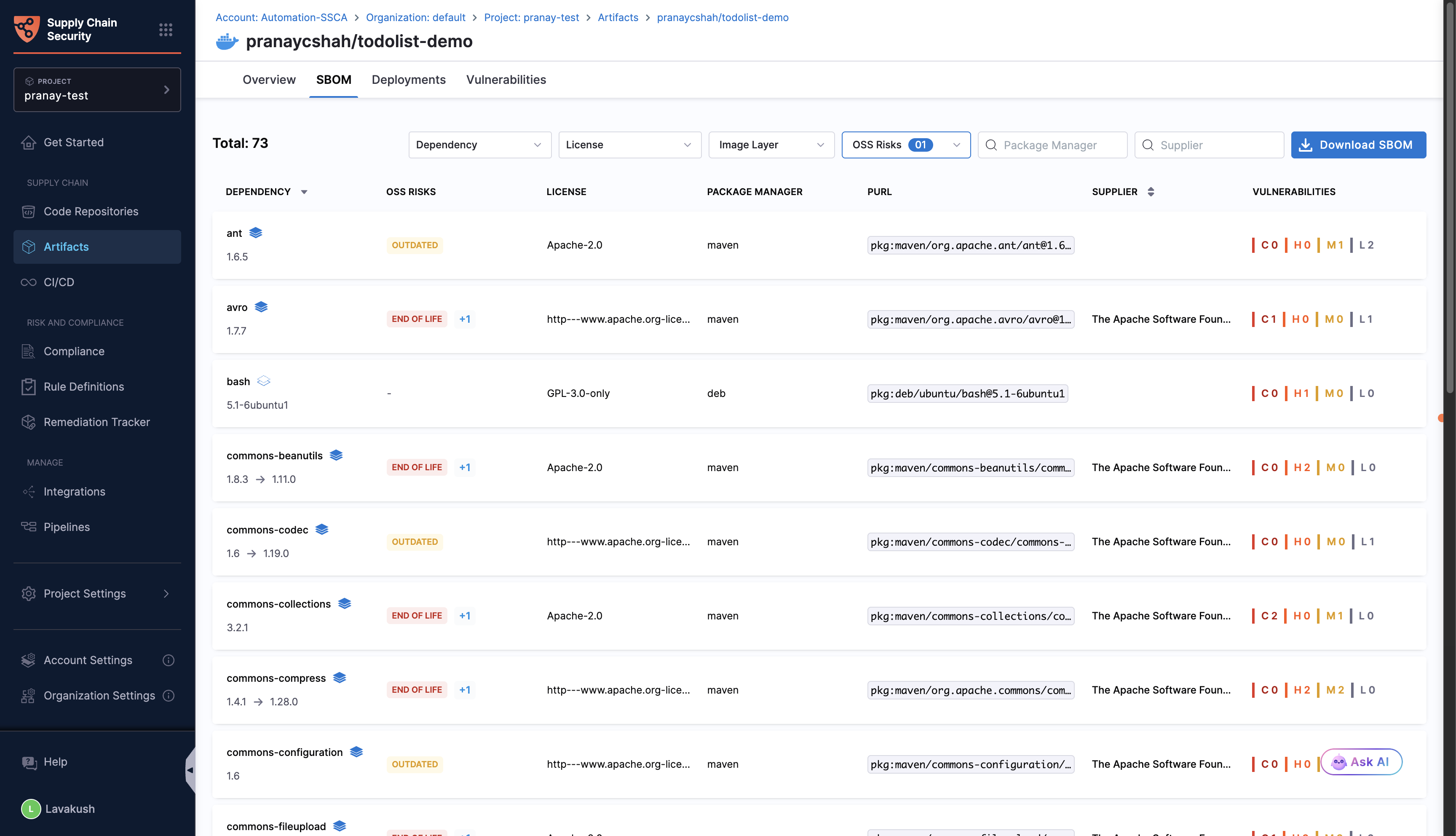 Open source software plays a critical role in the software landscape, with studies showing that over 90% of codebases contain open source components. While it accelerates development and innovation, it can also introduce security risks if not managed carefully. By assessing the components listed in your Software Bill of Materials (SBOM) against OWASP Top 10 risks helps to uncover risks such as outdated, unmaintained or end of life components, ensuring your OSS dependencies remain secure, reliable, and up to date. Running OSS risk checks plays a vital role in strengthening your software supply chain and maintaining trust in your applications.