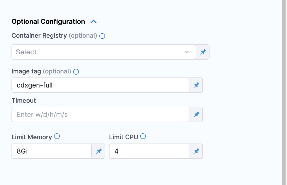 Container Registry: By default, Harness pulls cdxgen image from Docker Hub. To pull the image from private registry, select a connector that points to it.