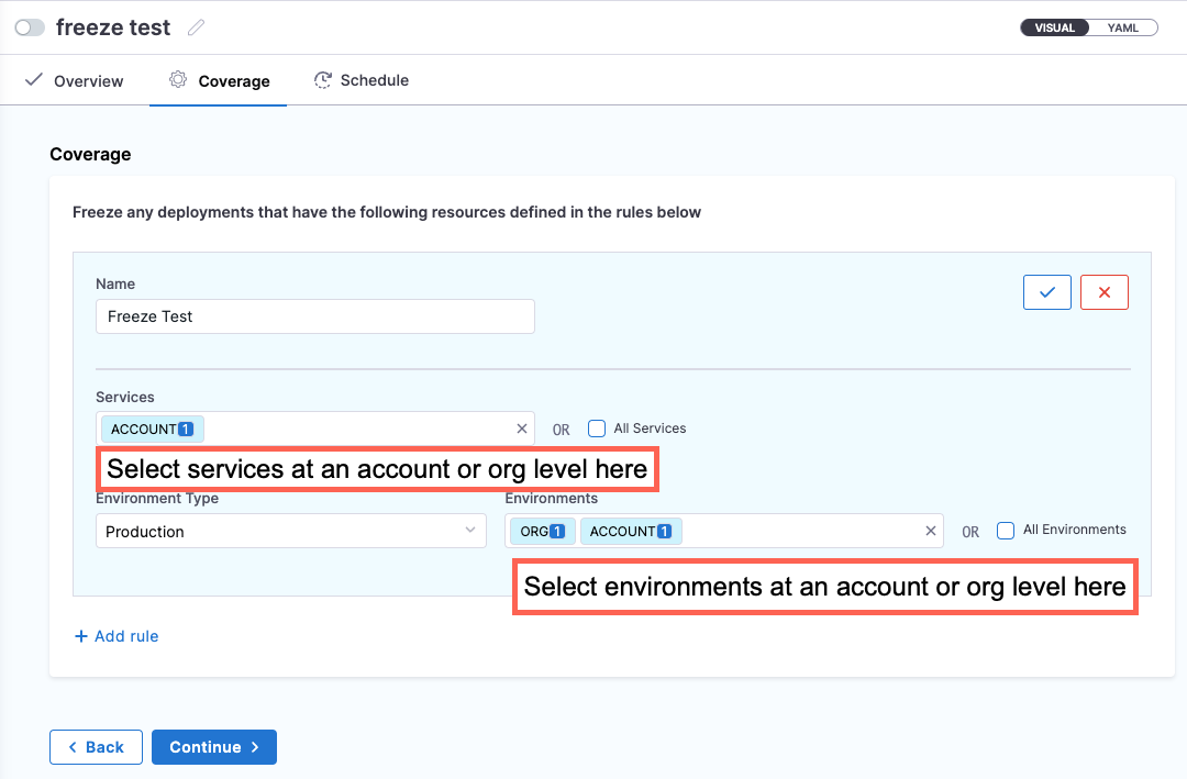 - Fixed an issue where saving a freeze window with email notifications configured in delegate mode failed with a YAML validation error. The UI-generated YAML for delegate selectors was incorrectly formatted, causing the save operation to fail even though no manual YAML edits were made. (CDS-118870, ZD-104033)