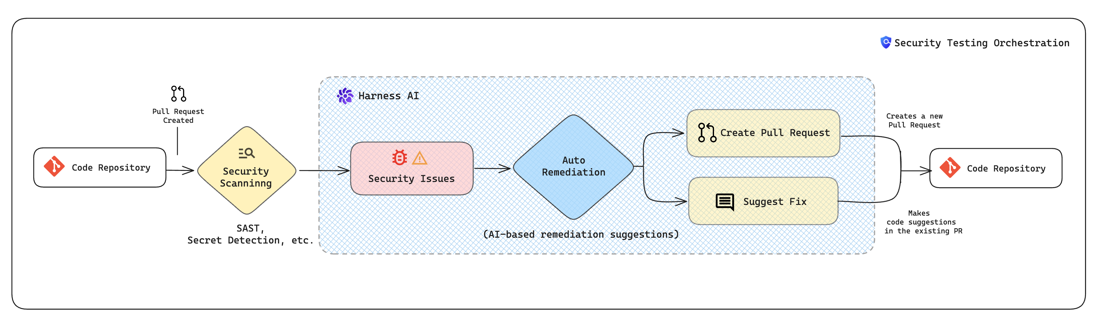 Harness AI reduces developer toil by streamlining and simplifying the process of fixing vulnerabilities. It enables developers and security personnel to manage security-issue backlogs and address critical issues promptly. It can help you create code suggestions and pull requests to remediate the issue right from STO. It can dramatically reduce your TTR, speed up your software delivery lifecycle, and improve the security posture of your applications and services.